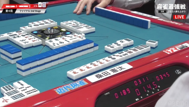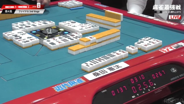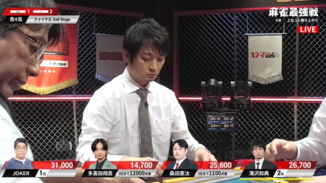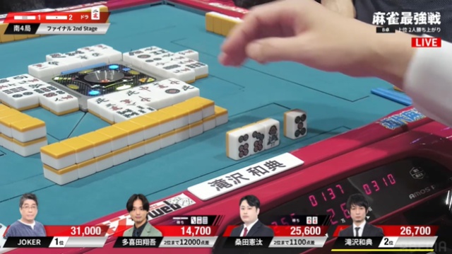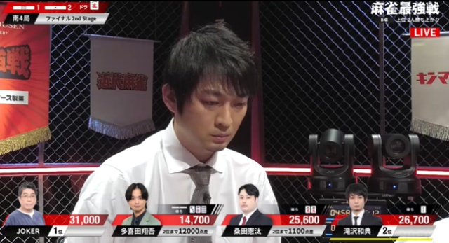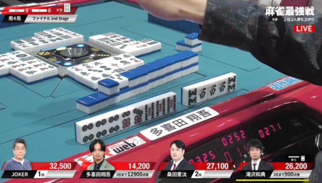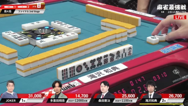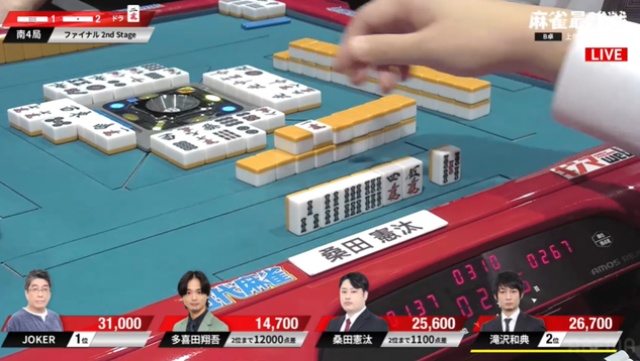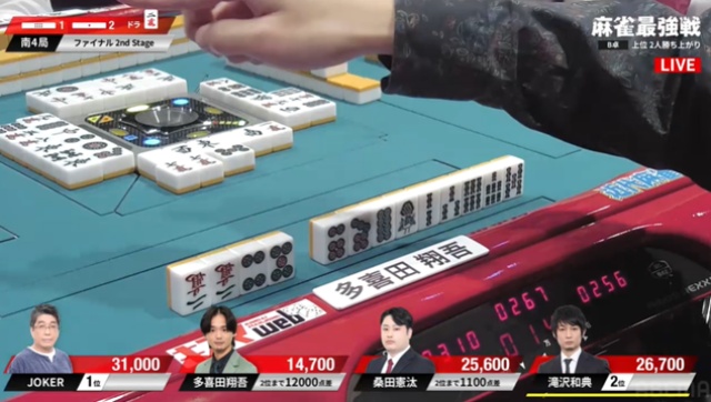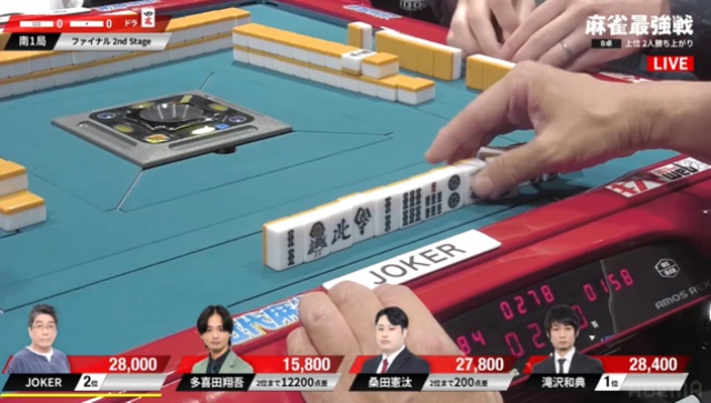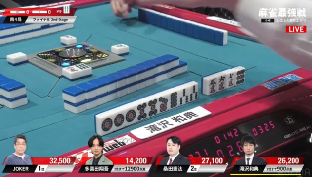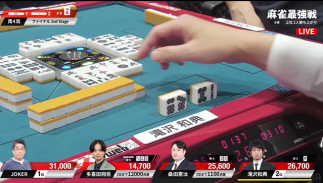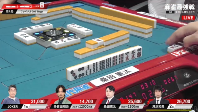 オーラス。桑田はアガれば勝ち上がり、多喜田はハネ満のツモもしくは倍満の出アガリ条件、