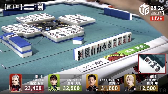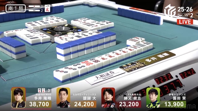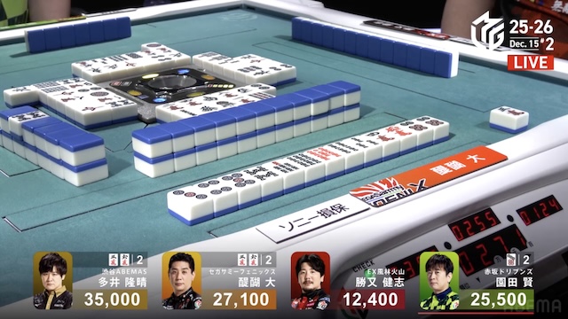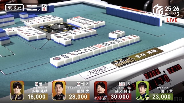 待ちでアガれば逆転トップのテンパイ。さすがに醍醐さんで決まったかと思いきや、多井さんが追いついて同じ![]()