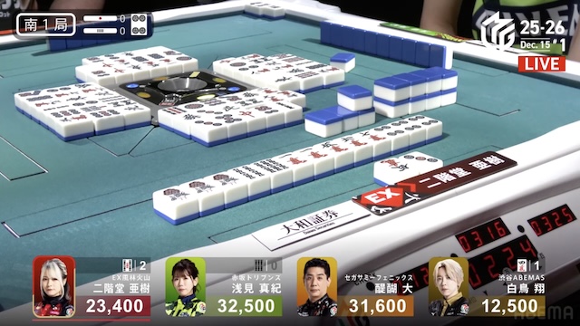 待ちのリーチが入った場面、トップ目の浅見さんは即やめ、ソーズのホンイツ仕掛け醍醐さんもすぐにやめだけど、(白鳥)翔ちゃんが仕掛けて、無筋の