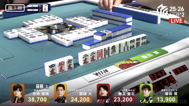 の同テンで追っかけリーチをして、勝又もツモれば2600オールのテンパイを入れた局。ここはどうなるかわからない、大事な局だなと思っていました。勝又から