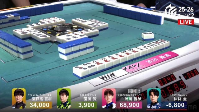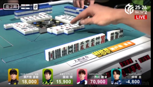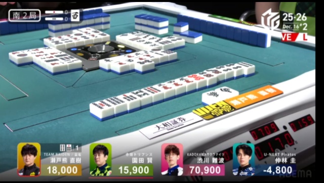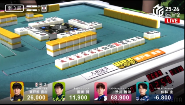 スタッツだけ見れば渋川と瀬戸熊が6回ずつアガるというデッドヒートを演じていたように見えるが、実際には親の連荘での加点が大きかった渋川が+100Pに迫る大きなトップ。しかし、リーチ8回の瀬戸熊は、間違いなく南場の主役だった。一方の仲林は、如何ともしがたい焼き鳥で、痛恨のハコ下ラス。