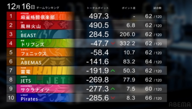 そもそも首位のKONAMI麻雀格闘倶楽部が最下位で、最下位のパイレーツが首位だった時期もある。