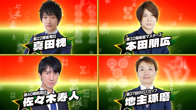 各プロ団体のタイトルホルダー、Mリーガー、著名人雀士の32名から勝ち残ったのは、第22期雀竜位・真田槐、第32期 麻雀マスターズ・本田朋広TEAM RAIDEN / 雷電)、第40期鳳凰位・佐々木寿人KONAMI麻雀格闘倶楽部)、第27回 BIG1カップ・地主琢磨の4名。決勝戦では、準決勝のポイントを半分持ち越し、4半荘終了時のトップが優勝となります。