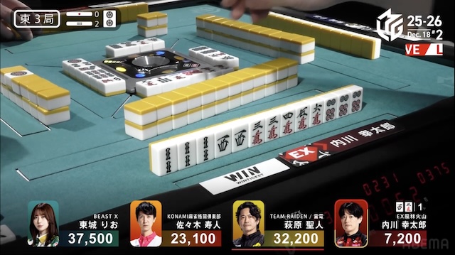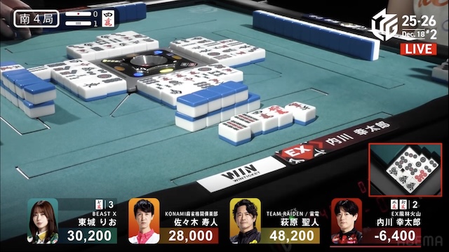 この試合はみんなパフォーマンスが安定して高かったですね。特に萩原さんと東城さんの出来はものすごく良かったと思います。東1局の親番で東城さんが1000オール、2600は2700オールをツモって、そのままオーラスまで進んだような展開でした。