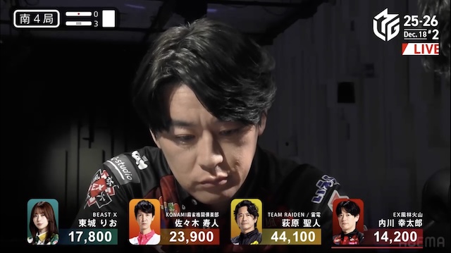 今日のメンツって、上位3チームと苦しんでいる雷電だったじゃないですか。その雷電の萩原さんがトップを取りましたけど、悪いところはほとんどなかったです。萩原さんは先制を取れるところではちゃんと先制できていたし、ものすごく良かったと思います。道中でドラ暗刻の手をアガれないとか、苦しんでいるところはありましたけど。