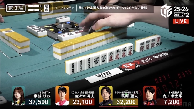 あと、僕は内川のことを見くびっていた可能性がちょっとありましたけど、今日は本当に良かったですよ。今日だけじゃないと思いますけど。内川はたまたまオーラスまで結果が出ていなくて、オーラスに結果が出たのが良かったですよね。あれだけ粘って、基本的にあれはダメ元なんですけど、それで4000オールをツモって3着に上がったのは、チーム状況も含めて万々歳じゃないですか。今は風林火山がいいんだなと思いましたし、内川も素晴らしかったと思います。