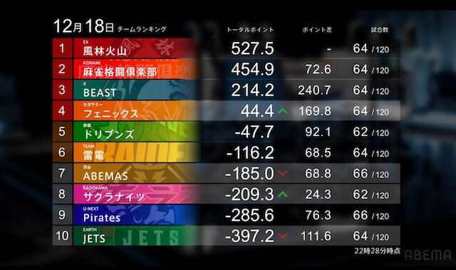 だが、選手たちは諦めなかった。少しずつ積み重ねたトップの数々が、チームに希望の光をもたらす。そしてこの日、ついにその瞬間が訪れる。茅森早香が叩き出した79600点という驚異のスコア。+99.6ptという大トップにより、ついにチームはマイナス域を脱出。順位も4位に浮上した。