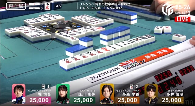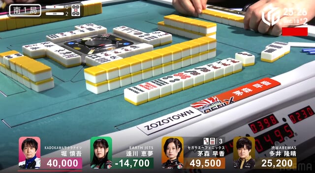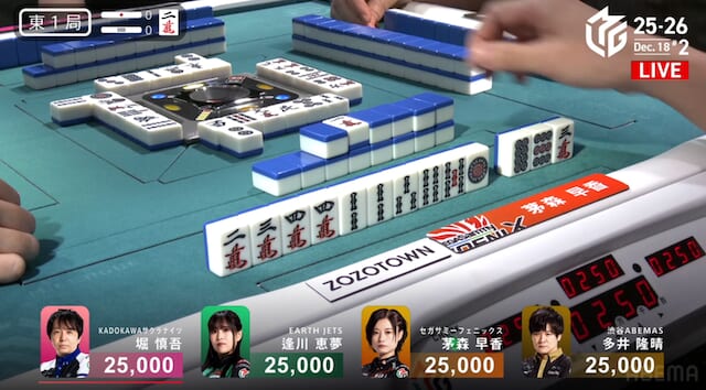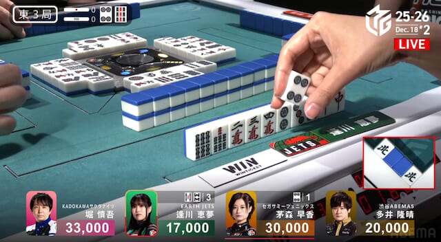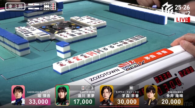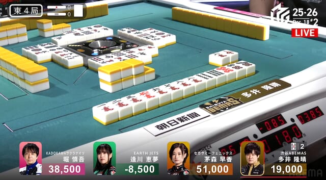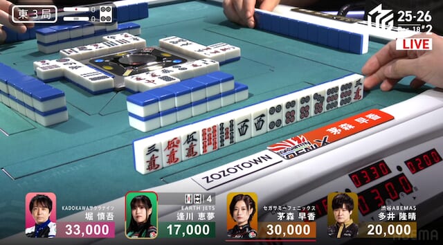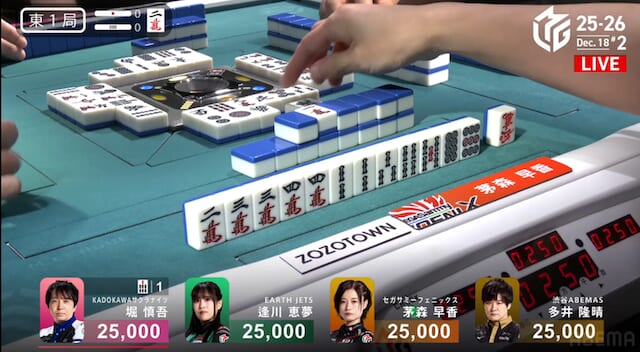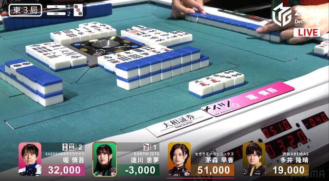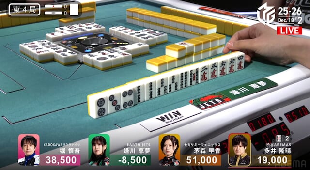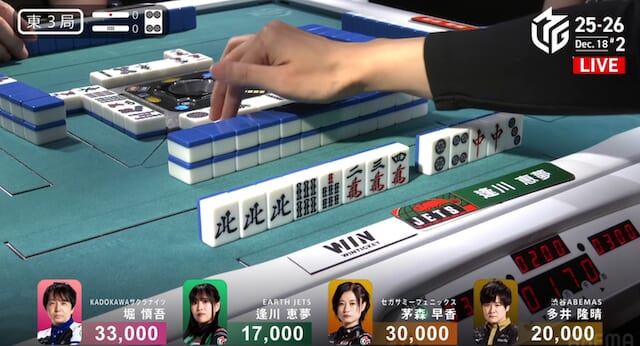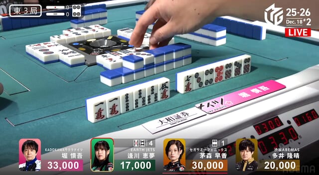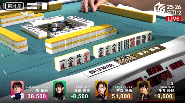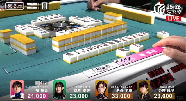 親番を迎えた堀が先制リーチ。逢川が一向聴で粘りを見せるも、堀が自らツモりあげる。リーチ・ツモ・ドラ1、そして裏ドラが3枚乗るという強烈な跳満のアガリ。これは逢川にとっても、多井にとってもきつすぎる展開。