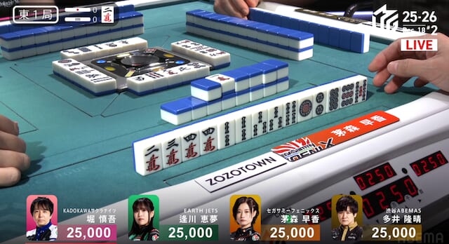 待ちを即リーチ。堀がタンヤオ一盃口ドラ1のテンパイを入れるが先に茅森がツモ。