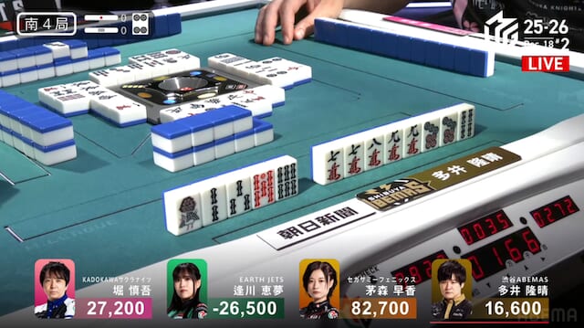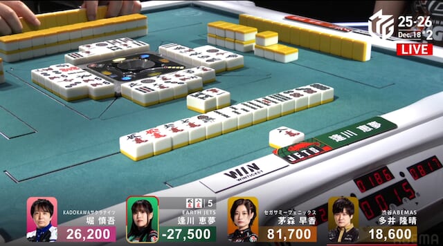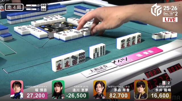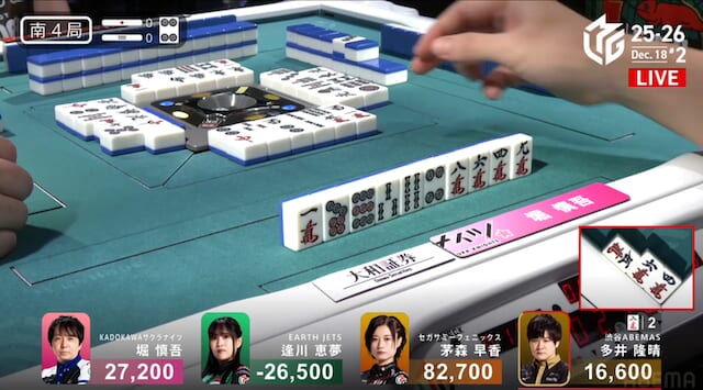 そして最終局。つらい展開が続いた逢川に、ようやく光が差す。先制リーチをかけ、自らツモり上げる。リーチ・一発・ツモ・平和・赤。
