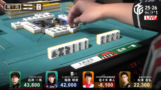 一馬と瑞原が突き抜けて、箱下に沈んだ寿人との上下差が大きくなってきた局面。微差ながら一馬がトップ目に立っている。瑞原は、3巡目にトイツが5組完成。打