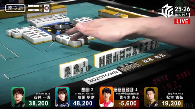3200は3500の和了。ライバル一馬の親を直撃で終わらせる、点数以上に大きな和了となった。試合後に一馬は、「チートイツの可能性もあるがわからなかった」と振り返った。山ゼロのリーチながらも、意図的に作り出した河が功を奏し、見事に引っ張り出した。