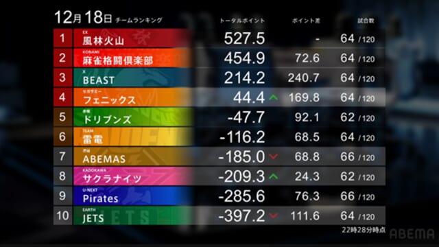 Mリーグレギュラーシーズン56日目。年内の試合数も少なくなる中、各チームの競り合いはますます熾烈になっている。