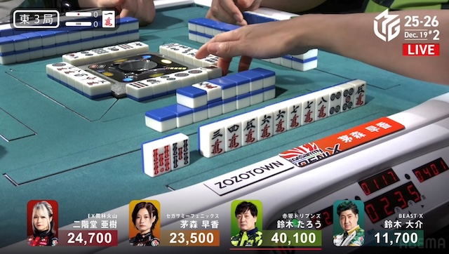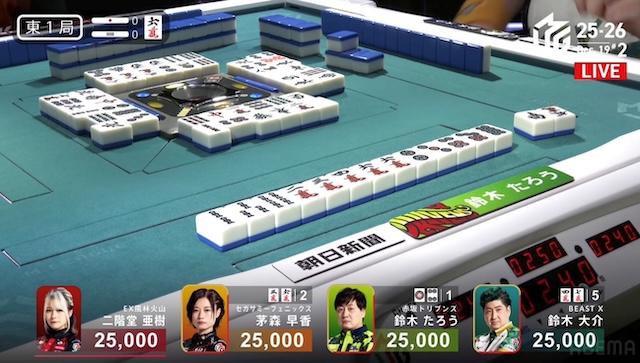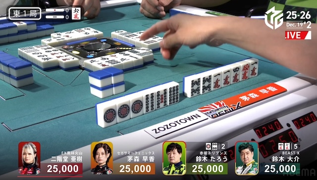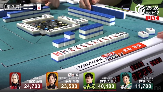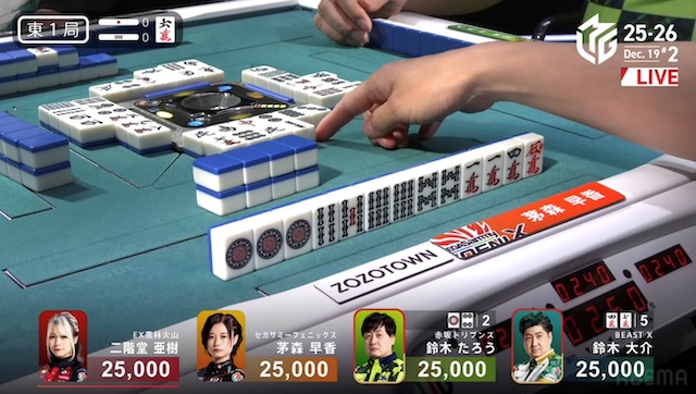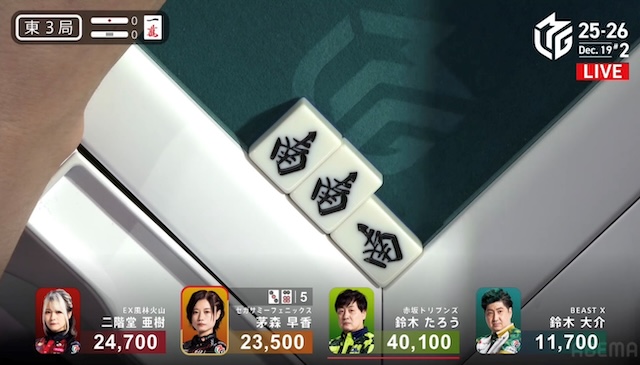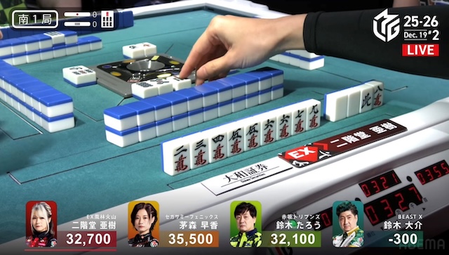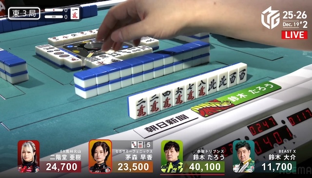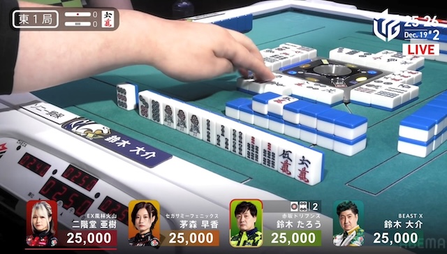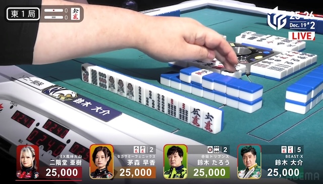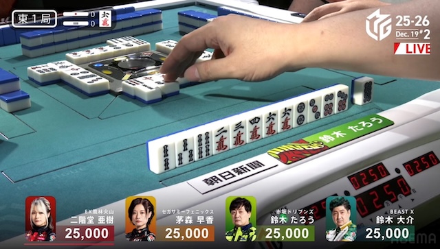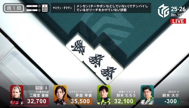 まずは、北家の茅森が待ちも打点も十分な先制リーチを放つ。