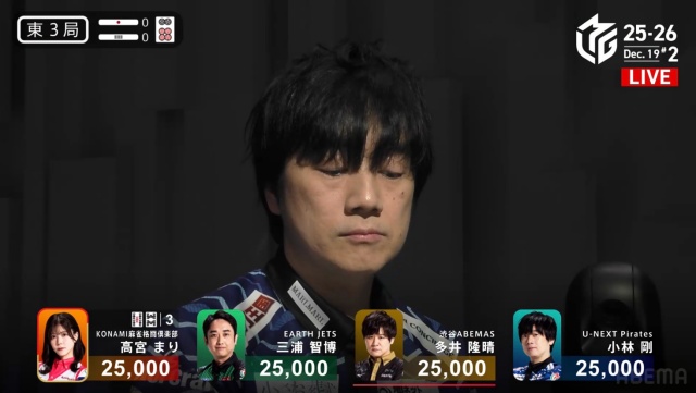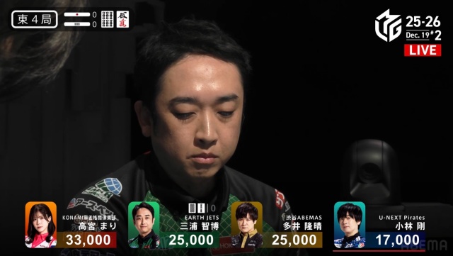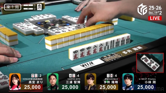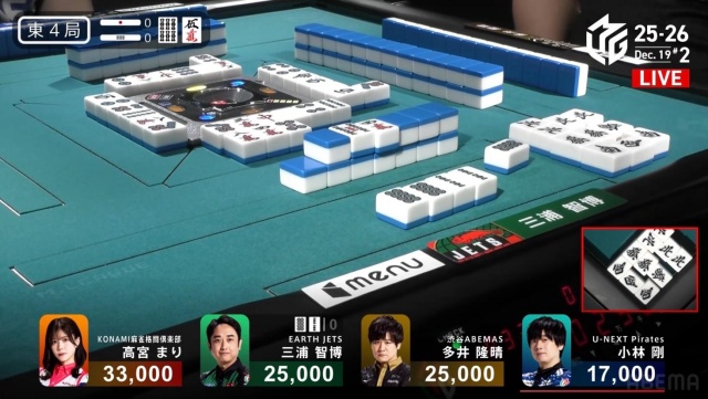 なんと小林はリーチ者の多井の動向はもちろん、その視線の先はトップ目の三浦へ。そこまで見据えた冷静な打ち回しをしていたのであった。