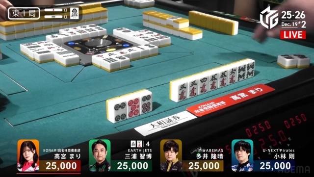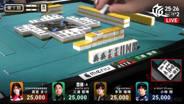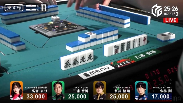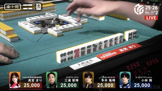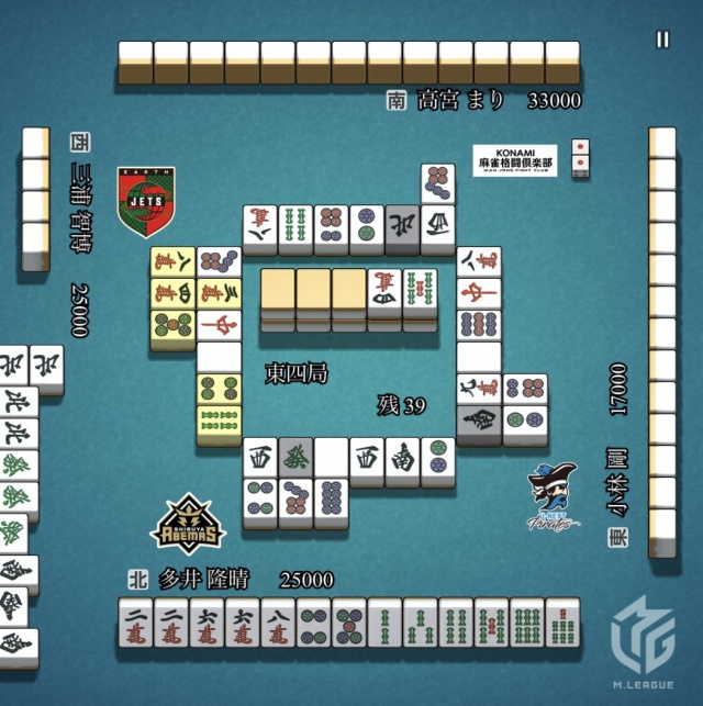 ピンフのみながら、積極的にリーチ攻撃に出た高宮に対し、小林が放銃となった局。