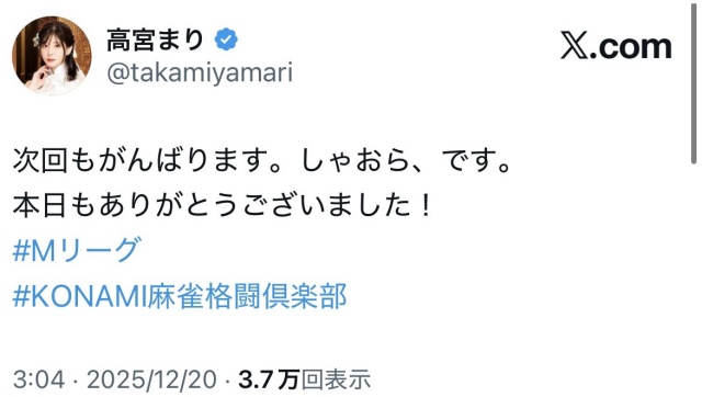 最後のツモ牌を倒したあと、高宮はふと後ろを見ていたのである。