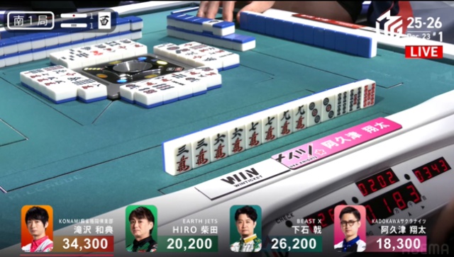 3着の阿久津翔太は現時点でのリーチ率が30%超えと、まっすぐ手を広げる打ち方で進めるも勝負手が入らず、最低限の仕事で3着を維持。