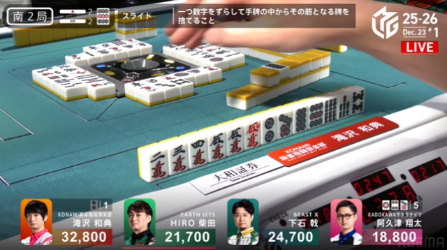 を切った。柴田いわく「手が悪すぎて、ホンイツよりに考えた」という一打は、悪い手の時にどう打つか、という1つの回答になりうる選択だ。もしかすると柴田は繊細な勝負を好むのかもしれない。こういった動きは相手の手を止めさせ、突き抜けたトップが取りにくくなり、それにより、例えば今日滝沢が取った3万点台のトップのような展開になりやすいからだ。