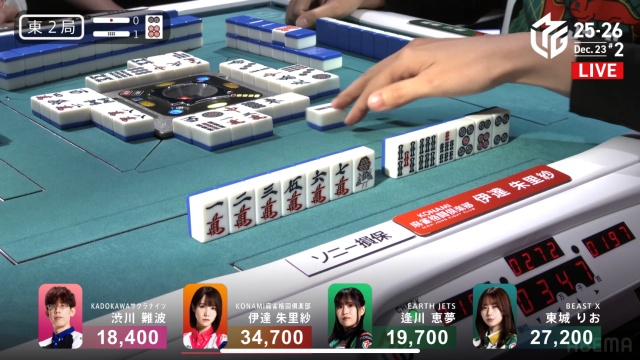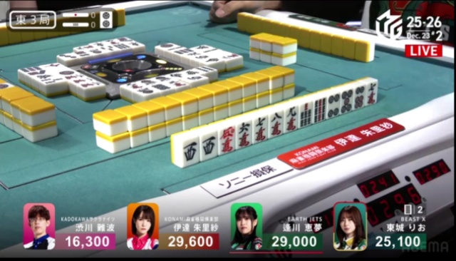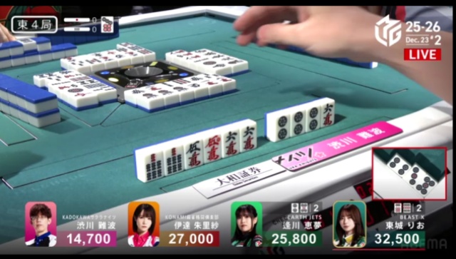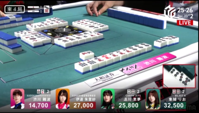 ピンズのホンイツで仕掛けていた逢川も、ここでようやく追いつく。1段目から守備的に進行していた伊達の絞りもあり、少し時間がかかってしまった。満貫確定の