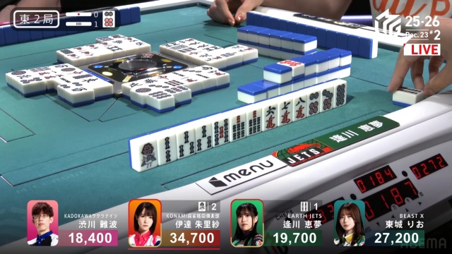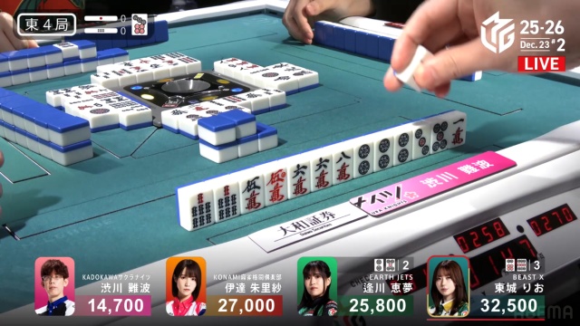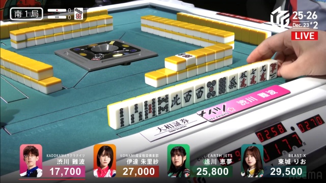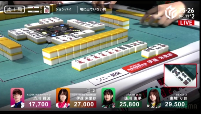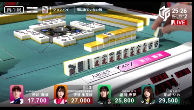 伊達のタンヤオのみの1000点で渋川の親番が終わる。