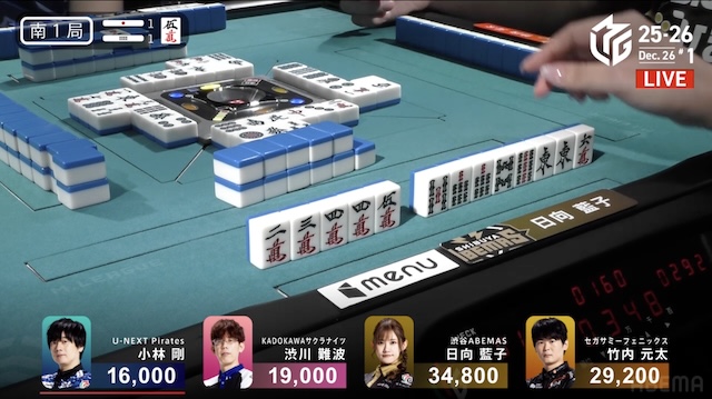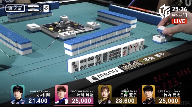 東2局は、日向さんの手が第1ツモでメンホンチートイの2シャンテン。かなりいい手でしたけど、この手で2巡目の【北】から鳴いたのはもったいなかったと思います。まさか鳴くとは思いませんでした。この局はドラが【西】で、オタ風の【北】をポンするとかなり警戒される局面になりますし、結局はホンイツのみの2000点のテンパイ止まりで流局。ちょっと微妙でしたね。1枚目の【中】も鳴かないくらいのほうがちょうどいいと思いました。