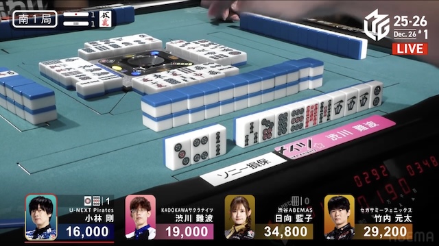 この局は最終的に渋川さんがアガりましたけど、1シャンテンで【2ソウ】【2ソウ】【3ソウ】【5ソウ】【5ソウ】の形を引っ張ったのが良かったと思います。【1ソウ】3枚見えで【2ソウ】暗刻も想定していたと思いますけど、後に危なくなりそうだから、先に処理したいと思う人も多いと思うんですよね。こういうところでアガリの手筋、攻めるための材料を全部残しておけるのは、渋川さんのいいところだと思います。