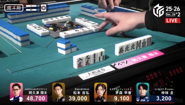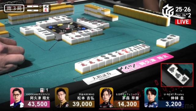 この巡目にして満貫テンパイであり、阿久津が放銃しようものなら2着へ転落である。