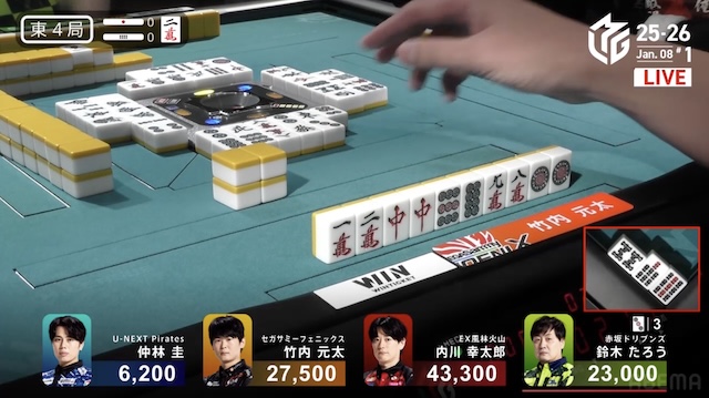 今季はいい人と悪い人と分かれているじゃない。この半荘だと、仲林さんは200沈み、鈴木さんは300沈みでしょ。竹内さんは140プラス、内川君は150プラス。その通りになっているよね。数字を持つと、数字の力っていうのがあるのよ。ゲームをするのにゆとりがある。これ、トップを獲ったのは内川君だけど、勝因が何かと言えば、何もしなかったこと。来るように合わせるってだけ。必要ないものを切る、そういうことをやったわけよ。竹内さんもそうだけど、竹内さんが内川君よりも出来が悪かったのは、東4局で当たり牌の