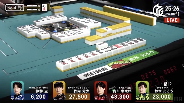 を一発でツモって6000オール。もうこれで決まりだと思うよね。点数はいっぱい動いたんだけど、内川君がトップを獲るように回っている感じがした。本来だったら、鈴木さんなんかは力はあるんだけど、その力が今はないわけよ。連に絡めばOKくらいのイメージ。だから下手したら3着だなと、僕は点数あるときにも思っていたね。しょうがないと思うよ。
