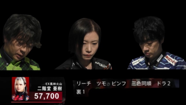 リーチ・ピンフ・三色同順・裏1、8000は9800、早くも勝負を決めたと言っても過言でない加点に成功する。