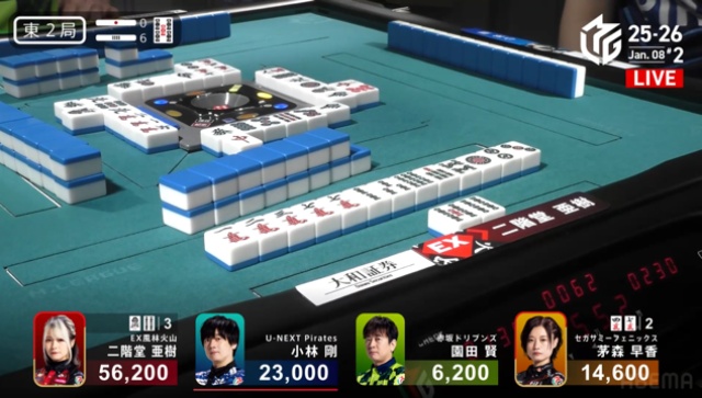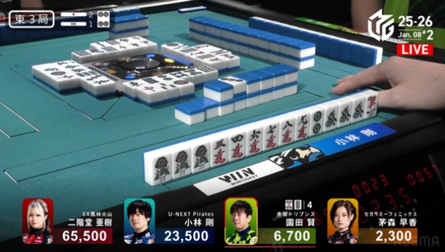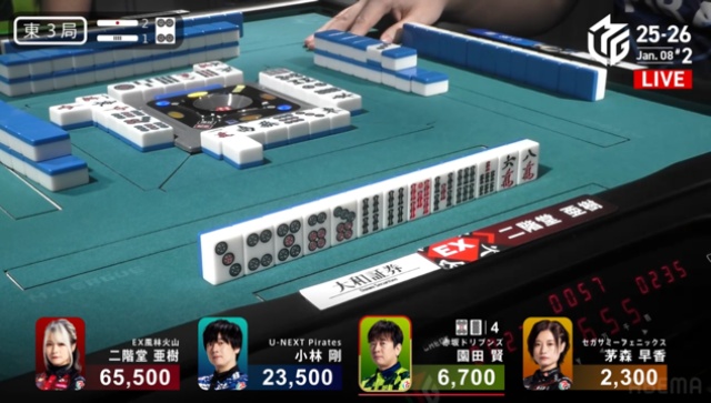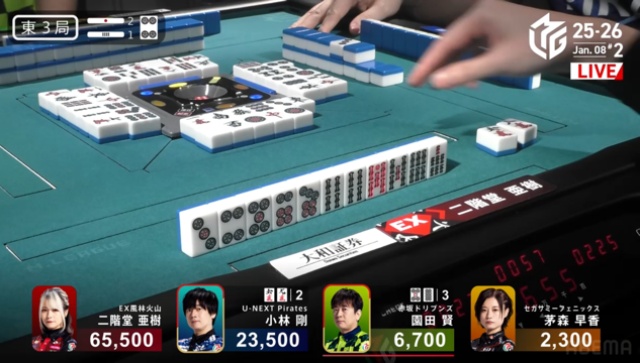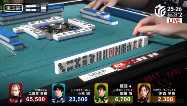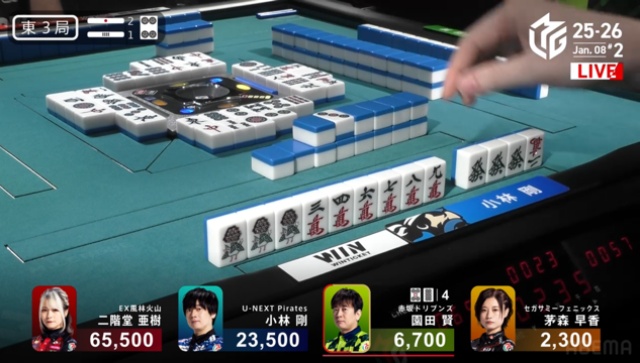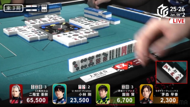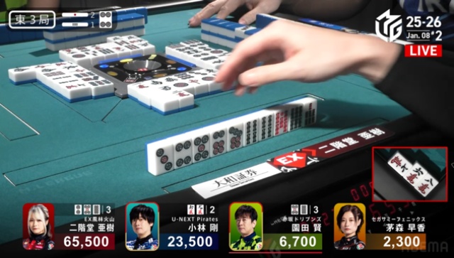 園田のリーチ、亜樹のプッシュがある中、小林にテンパイ。