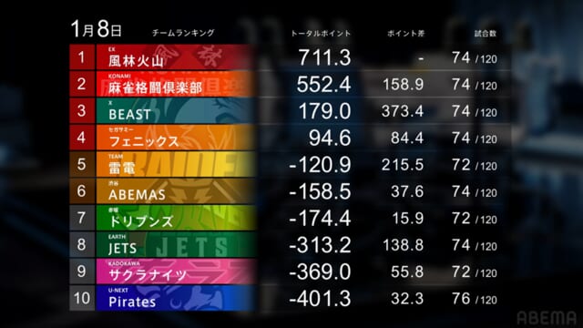 さらにチームランキングに目を移してみると、首位の風林火山を追いかける格闘倶楽部と、ボーダー以下の3チームが相まみえる構図にもなった。特にサクラナイツとPiratesは、年明け以降冷たい風が吹きさらしている。いよいよ終焉が見えてきたレギュラーシーズン、チームの危機救うことができるか。
