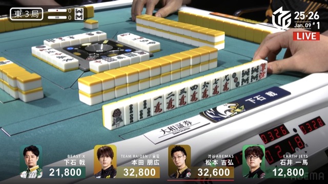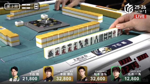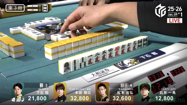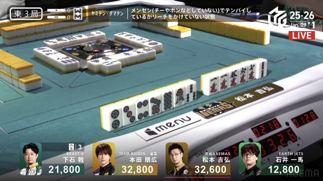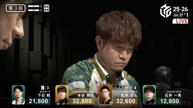 本田の先制攻撃から松本の満貫ツモと荒れ模様の立ち上がり。