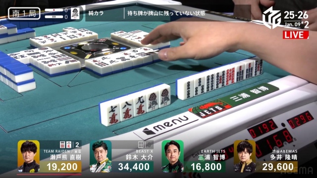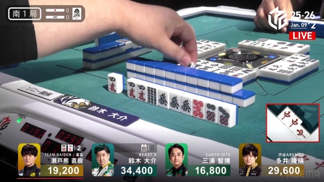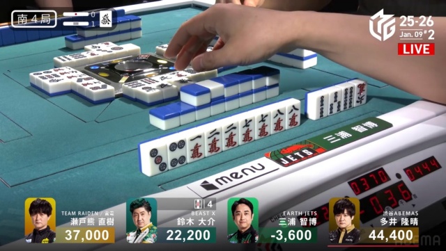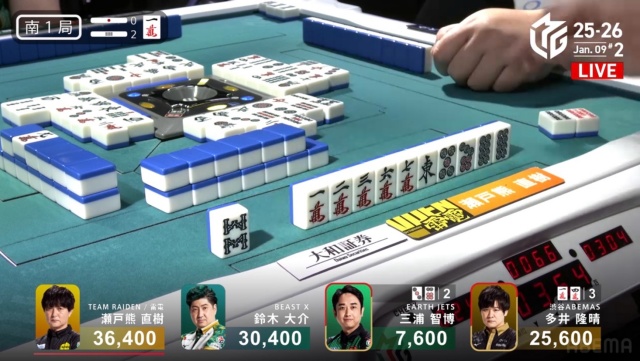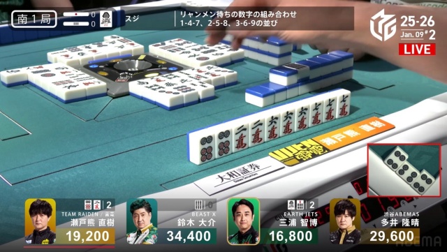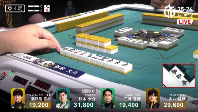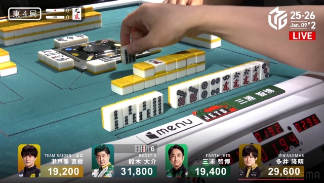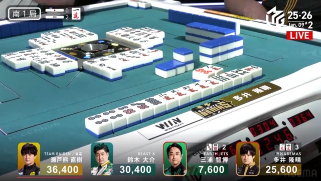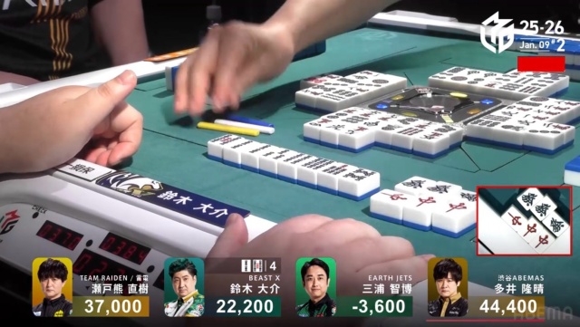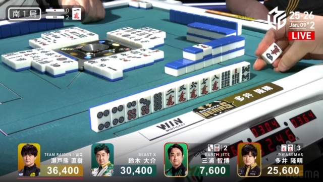 ここまで放銃率8%という多井。光る守備力を駆使しながら、瀬戸熊の背中に、しっかりとついていく。