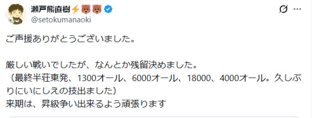 瀬戸熊は長年活躍していたAリーグから無念の降級。今はB1リーグに所属している。