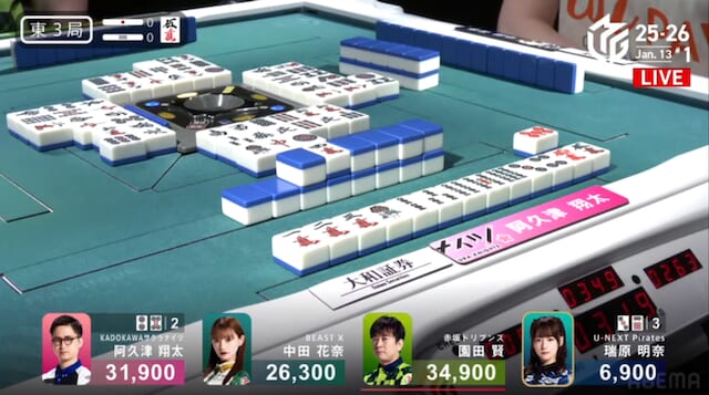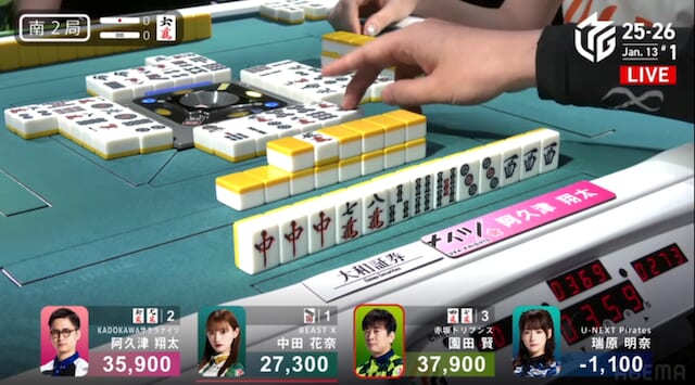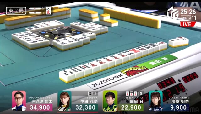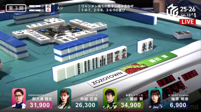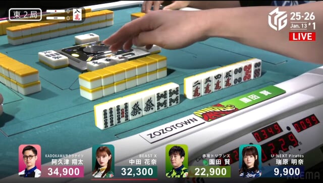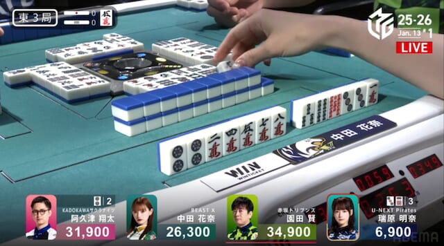 は瑞原さんのリーチの現物ではあるんだけど、早めに仕掛けて行ったところに相手からリーチが来て、もう一人も押していて、園田さんも普通だったら守備に回るんじゃないかなと思ったから、そこは少し違和感があったかな。阿久津君も