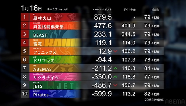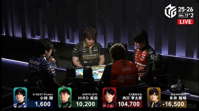 EX風林火山の内川幸太郎に今シーズン最高得点である104,700点のトップを取られた挙句に、▲16,500点の特大なラスを押し付けられたのだ。