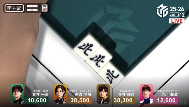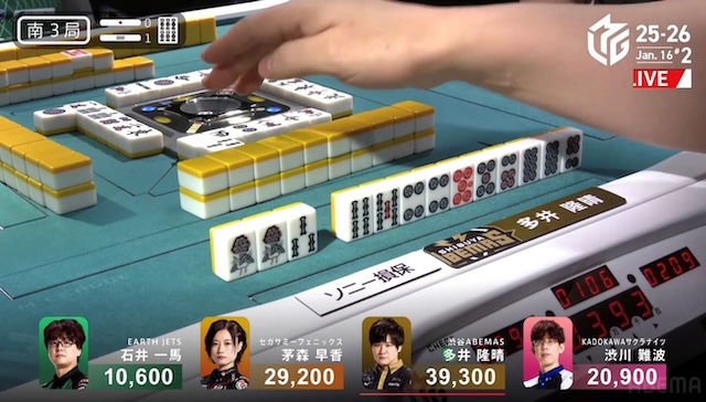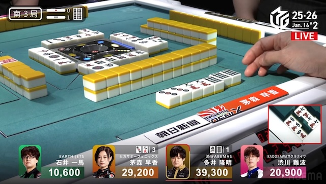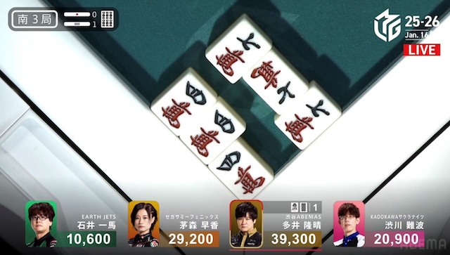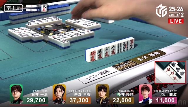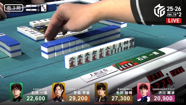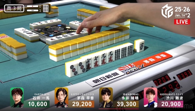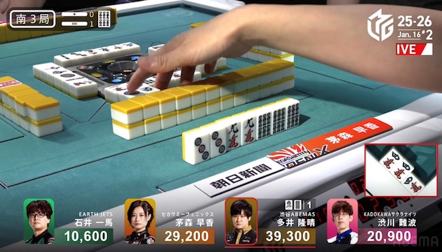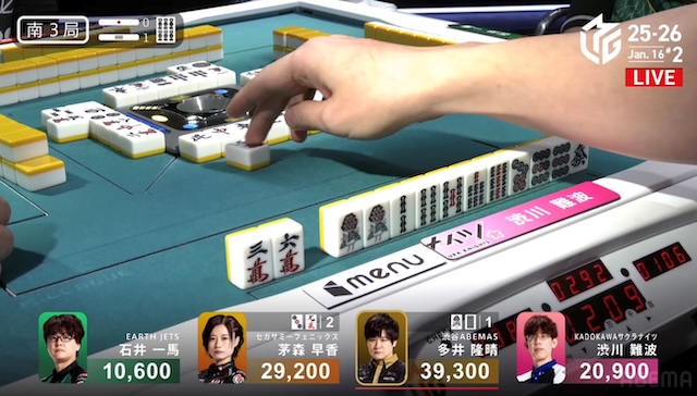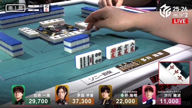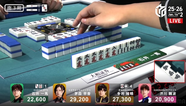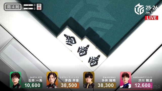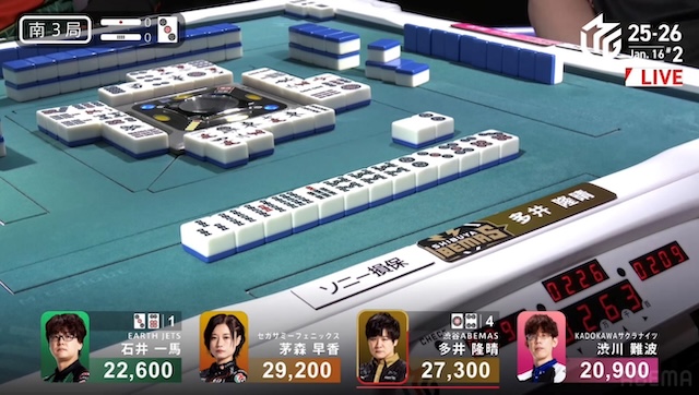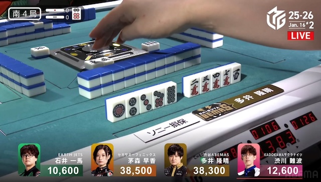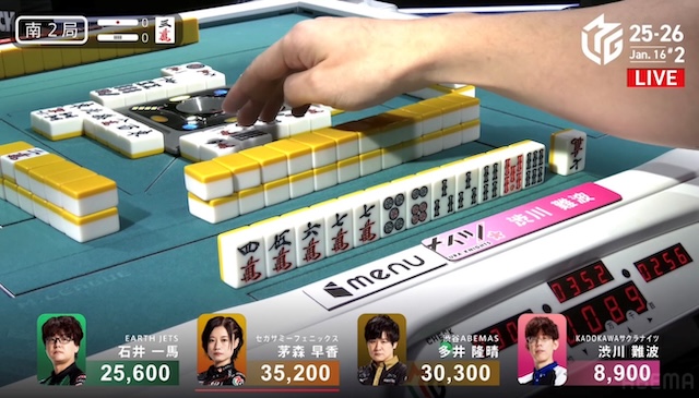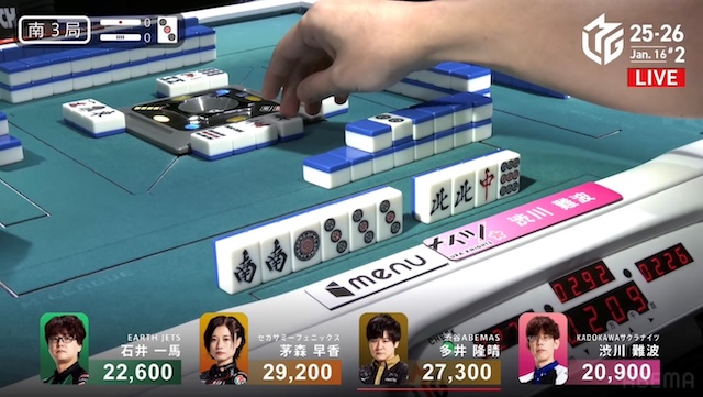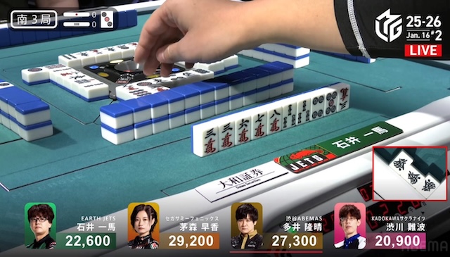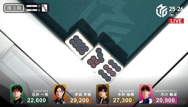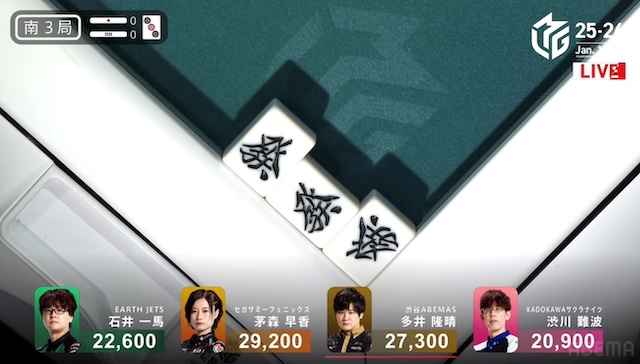 先にテンパイを入れたのは一馬で、他家からリーチが来る前に躱しておきたいところ。