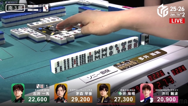 多井にも役ありテンパイが入り、リードを広げるためにリーチを打った。