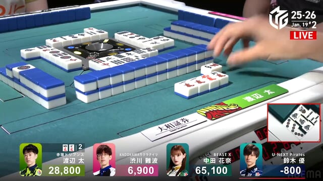 チーが準備されていたものであること、ノータイムであったこと、そして何より中田が押していることから、この局の和了りを委ねたのだ。