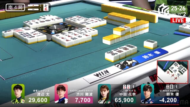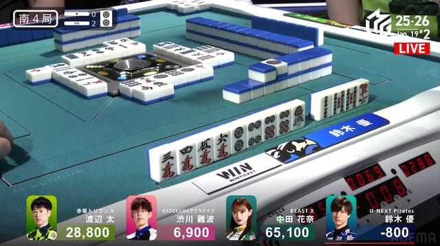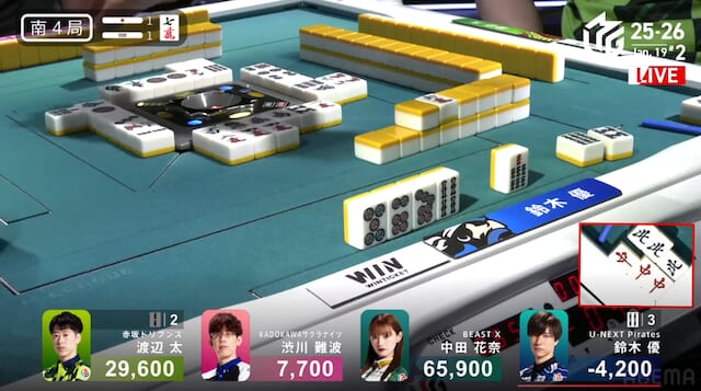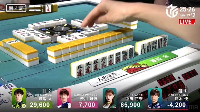 素知らぬ顔でやった優のこの仕掛け。三副露ということで中田を迂回させることにも成功し……