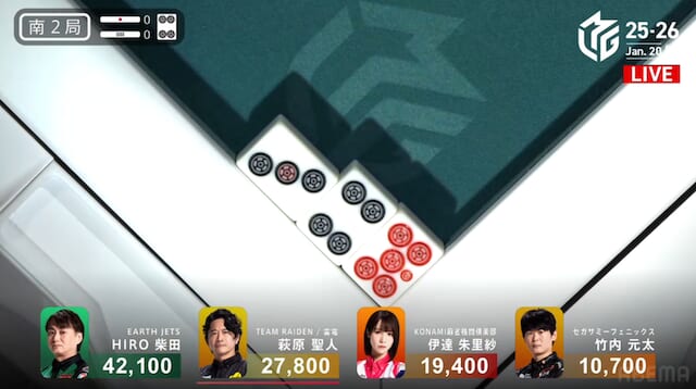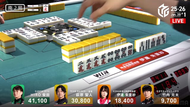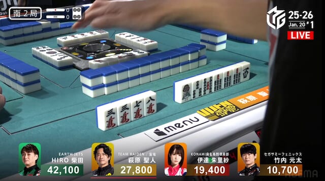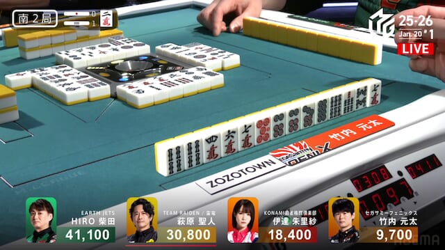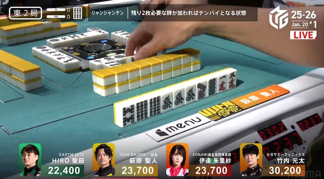 ポンしてイーシャンテンの手だったんですけど、13巡目に伊達さんが降りるんですよ。完全に受けて。降りてる最中に、竹内さんの