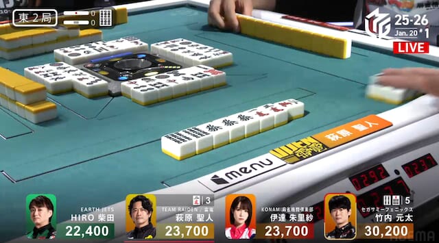東2局2本場、この局の4000オールは面白かったですね。萩原さんは7巡目に2枚目の