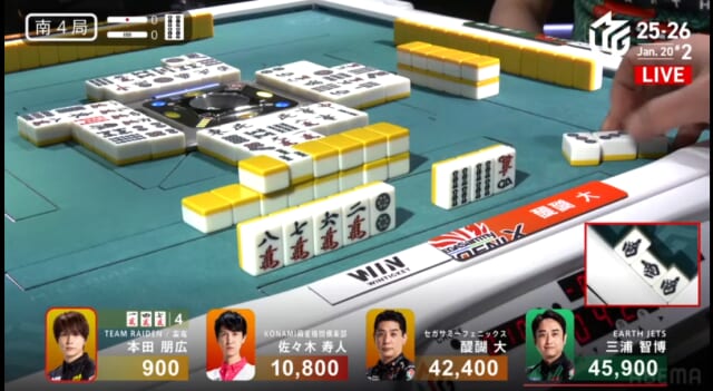 を平然と見逃す本田。ラス確のアガリとなるためだが、素点と、ボーダー争いをしているセガにトップを獲らせないという観点から、得か損かは微妙。