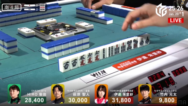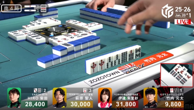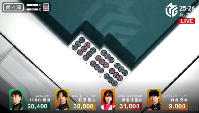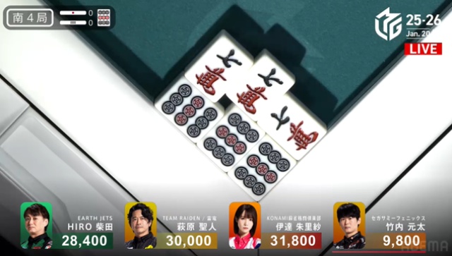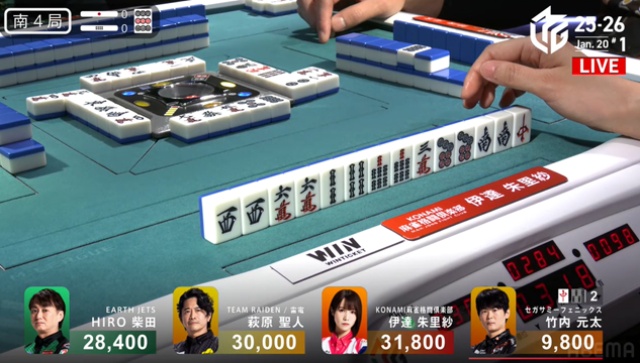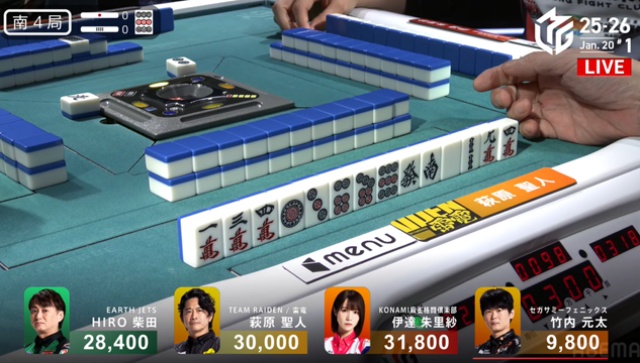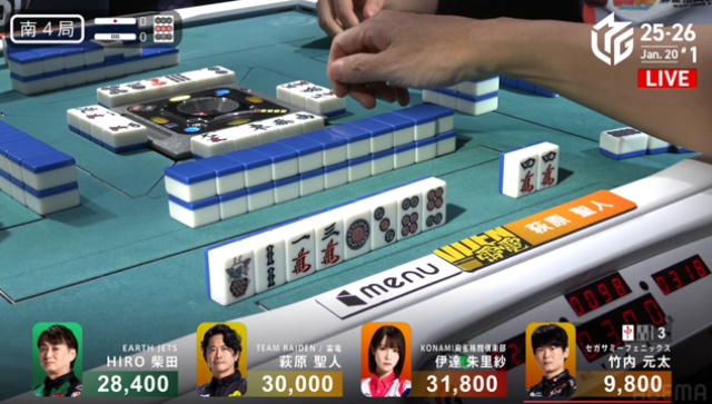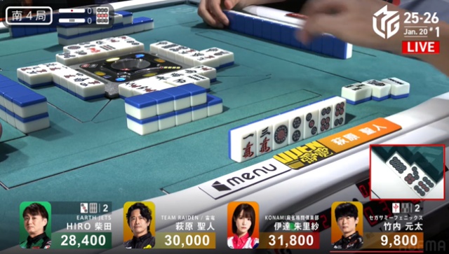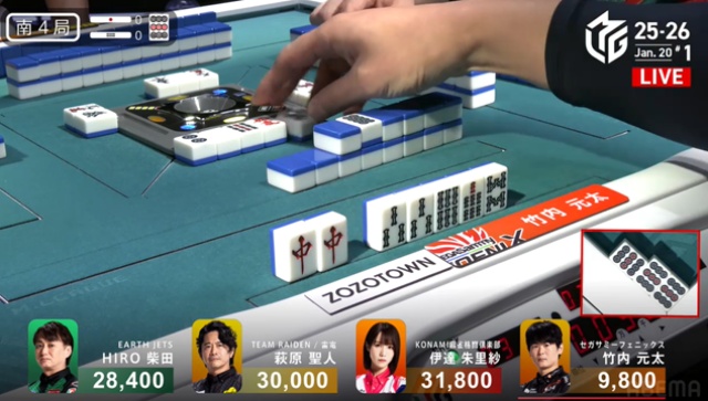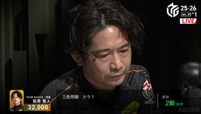 。萩原がすかさずチー、急所を2つ鳴いてアガればトップのテンパイ。3者にテンパイが入り、次の瞬間誰かのアガリが発生しておかしくない緊張感ある局面に。