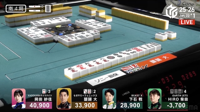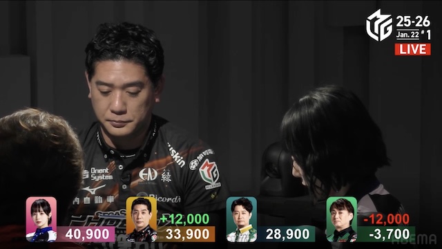 今日は東1局で、オカピー(岡田紗佳)がカン【5マン】待ちでリーチしたのよ。それにHIRO柴田【赤5マン】を切って、それが12000になった。まあ、柴田君はこれを打つのはいいけど、だったら点数戻せって。これを戻せないんだったら打っちゃダメだって。僕が前回HIRO君のことを言ったときに、たしかマイナス100くらいだったと思うけど、今日はこれでマイナス200、そこで打つのが親リーチに向かって【赤5マン】を打つ麻雀ならちゃんと点数を戻さないとダメ、それができないなら放銃しちゃダメだって。それは言っておいてください。