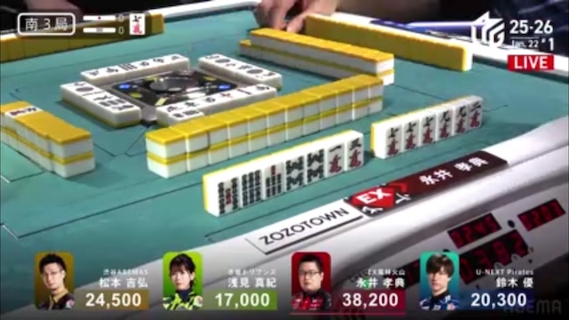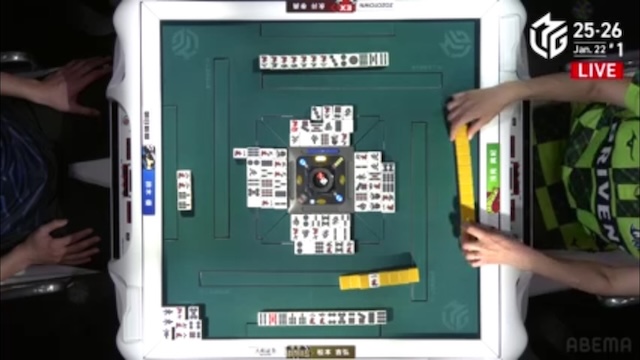 さらに松本もテンパイをもぎ取り、結果は永井・優・松本の3人テンパイで流局となった。