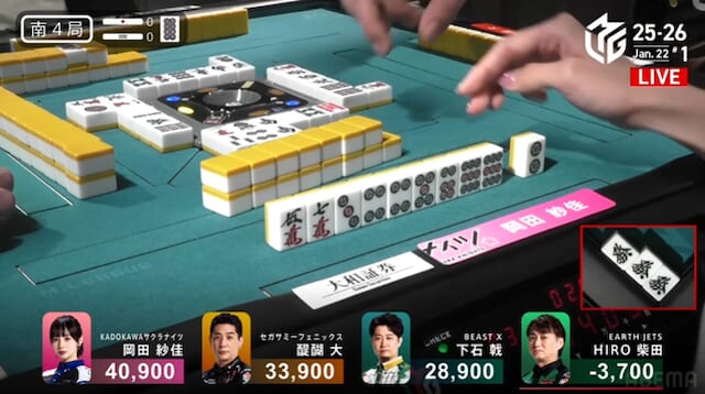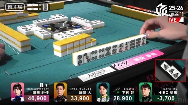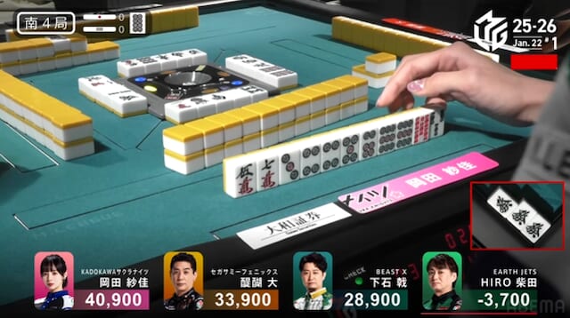を引くとフリテンになってしまう。アガリトップの条件を満たしている岡田にとって、ここで打点は不要。好形変化を重視して打