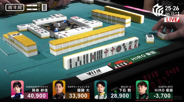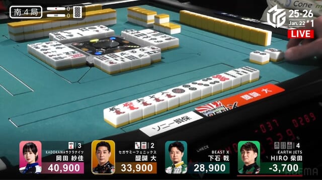 を切るが、これが醍醐への放銃に。リーチ・一発・ピンフ・赤2・ドラの12000点。醍醐が見事な逆転トップをもぎ取った。